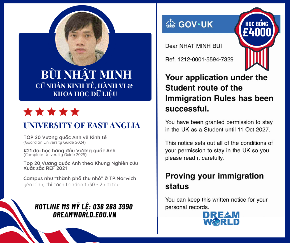 Chúc mừng bạn Bùi Nhật Minh đậu VISA Anh và nhập học khóa Cử nhân tại Đại học danh tiếng University of East Anglia.