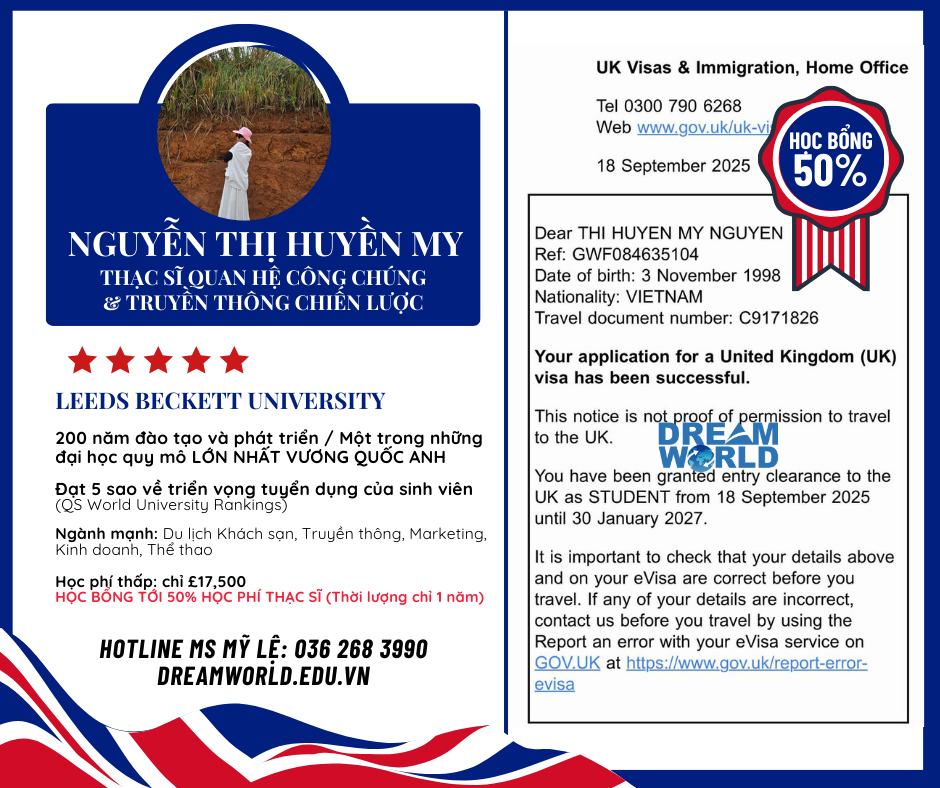 VISA Anh và Học bổng "kịch trần" 50% học phí khóa Thạc sĩ về tay bạn Nguyễn Thị Huyền My, tại Leeds Beckett University - Một trong các đại học quy mô lớn nhất Vương quốc Anh, đồng thời rất thu hút sinh viên quốc tế nhờ chất lượng 5 sao với chi phí cực hời.