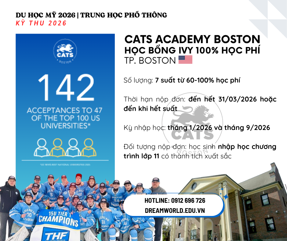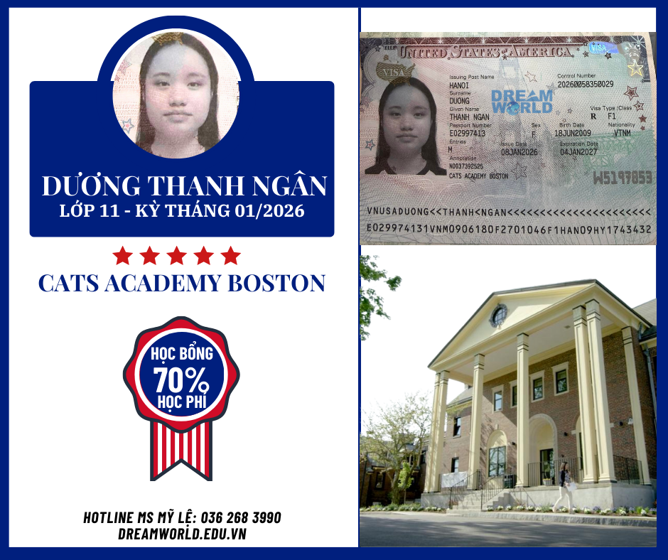 Học sinh Dương Thanh Ngân xuất sắc giành học bổng 70% học phí và sẽ theo học lớp 11 tại trường trung học danh tiếng CATS Boston. Ngôi trường nội trú uy tín xếp hạng A+ theo Niche, tại thành phố Boston.