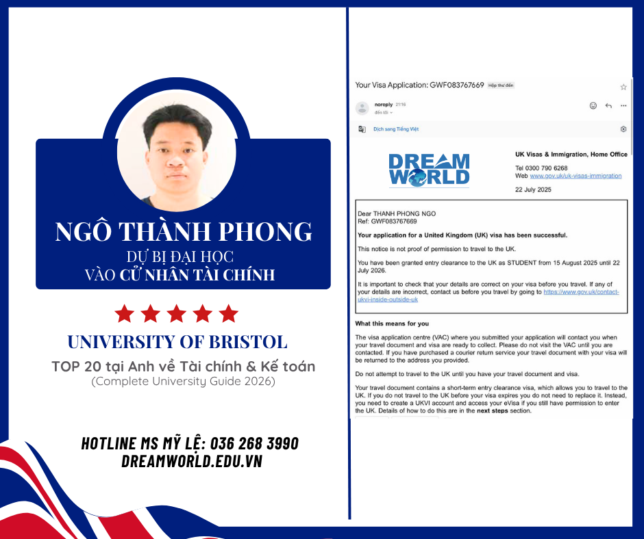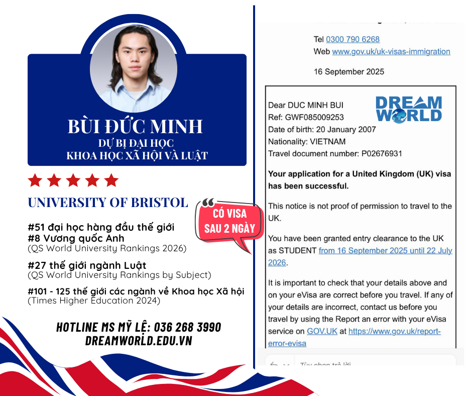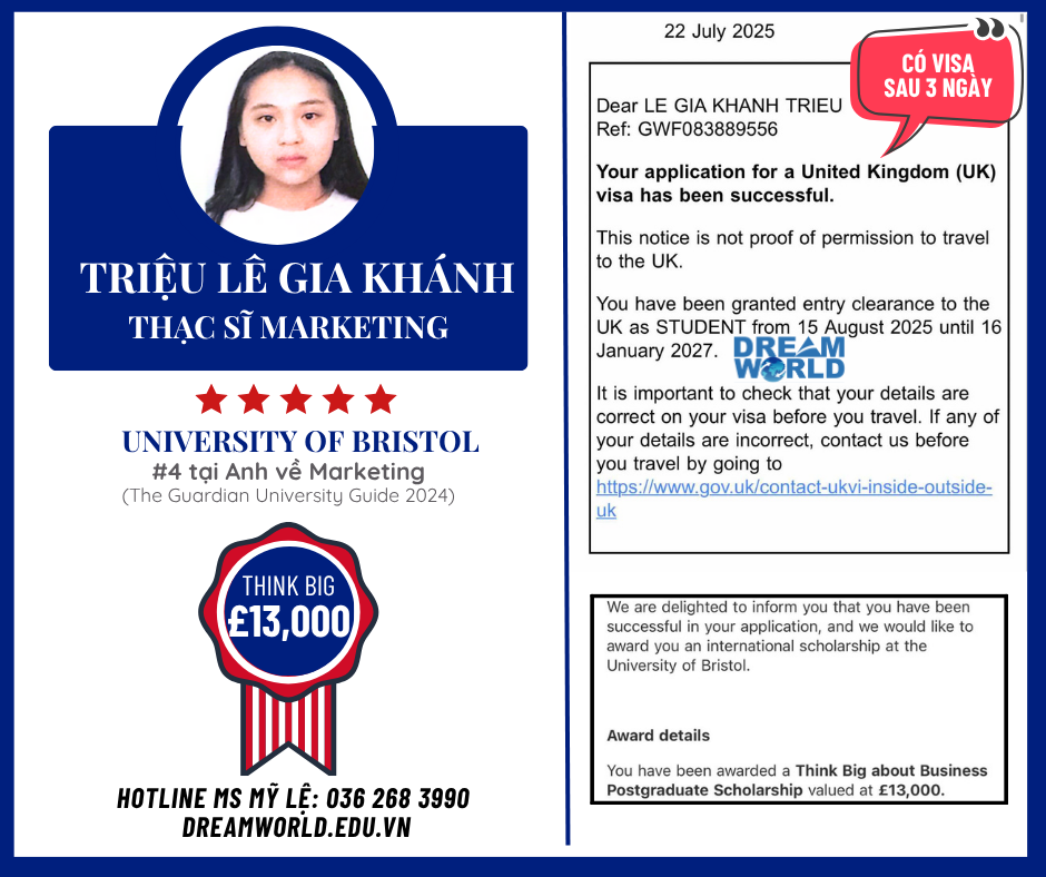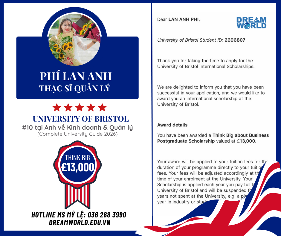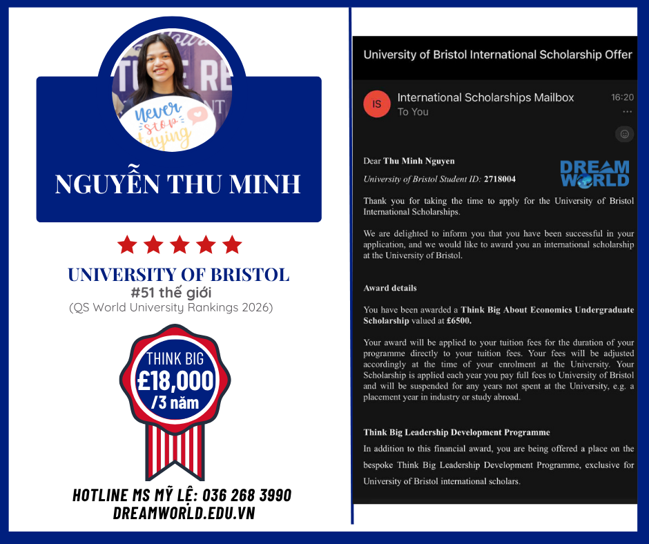 Năm thứ 4 liên tiếp sinh viên Dream World chinh phục thành công học bổng THINK BIG TỪ UNIVERSITY OF BRISTOL, đặc biệt năm nay có cả bậc Cử nhân và Thạc sĩ rất đáng tự hào!