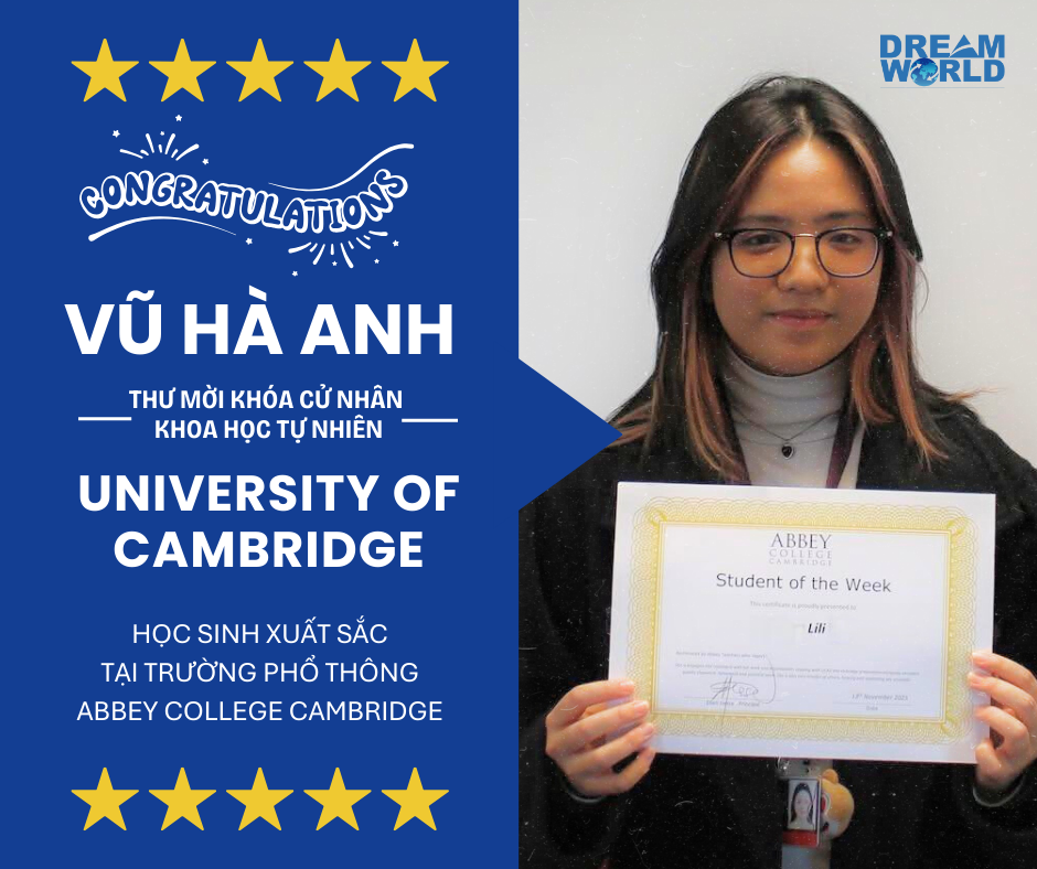 Thật sự tự hào và chúc mừng bạn VŨ HÀ ANH đã nhận thư mời nhập học từ University of Cambridge - xếp hạng #6 đại học tốt nhất thế giới và là trường đại học "trong mơ" của các sinh viên quốc tế.