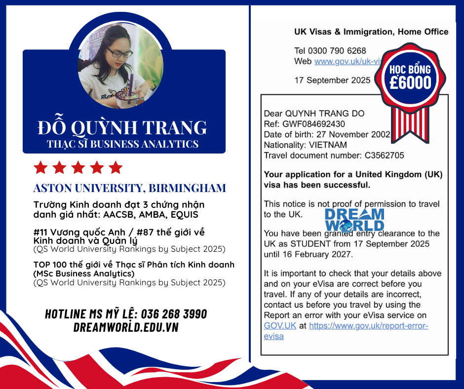Chúc mừng bạn Đỗ Quỳnh Trang có VISA Anh, theo học ngành HOT nhất hiện nay - Business Analytics tại Aston University, Birmingham.