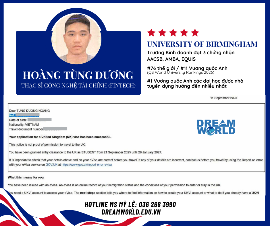 Tùng Dương: VISA Anh ngành Fintech tại University of Birmingham - Top 80 thế giới