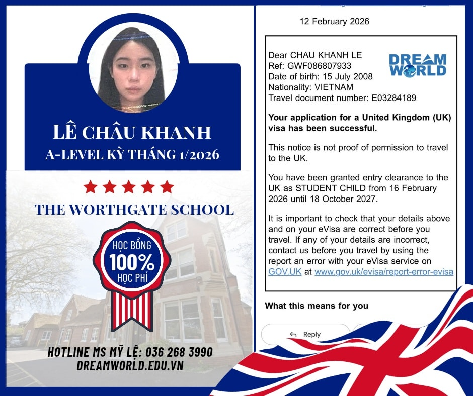 Khai xuân đắc lộc năm mới với VISA Anh và học bổng 100% học phí dành cho bạn Lê Châu Khanh - theo học Alevel 5 kỳ tại trường phổ thông danh tiếng The Worthgate School.
