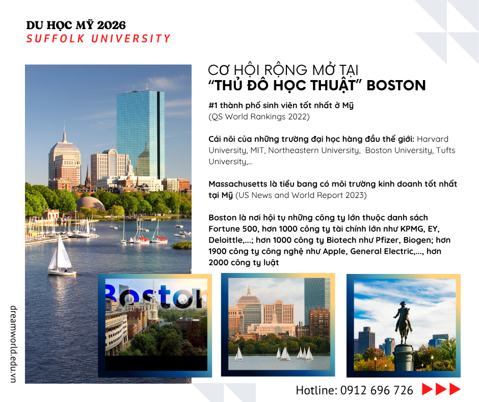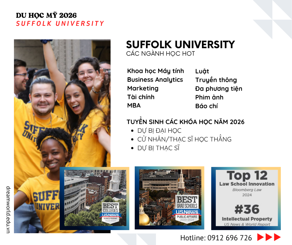 HỌC BỔNG THẠC SĨ TỚI $27,000/NĂM VÀ CỬ NHÂN LÊN TỚI $88,000/4 NĂM TẠI "THỦ ĐÔ HỌC THUẬT" BOSTON - Trường đại học danh giá Suffolk University tuyển sinh kỳ tháng 1 và 8/2026, đem đến vô vàn cơ hội thực tập và trải nghiệm học tập ở ngay trung tâm thành phố.
