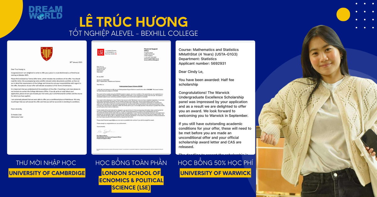 - Cơ hội vào thẳng các đại học Top Vương quốc Anh và thế giới: Tiêu biểu như học sinh Trúc Hương từ Dream World được nhận vào University of Cambridge - Top 3 thế giới