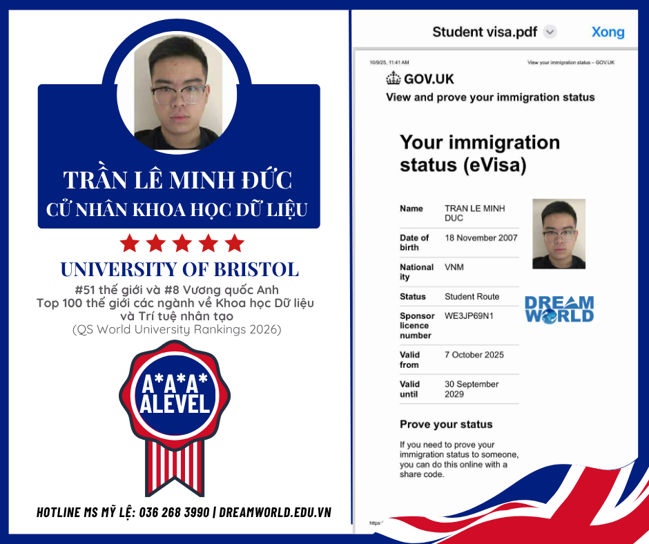 Từ học sinh trường Chuyên Toán và Khoa học NatMatSci top đầu UK thẳng tiến đến đại học thuộc RUSSELL GROUP - tự hào với bạn Trần Lê Minh Đức đạt 3 điểm A* Alevel, và đậu VISA Anh để học Cử nhân Khoa học dữ liệu tại trường danh giá University of Bristol.