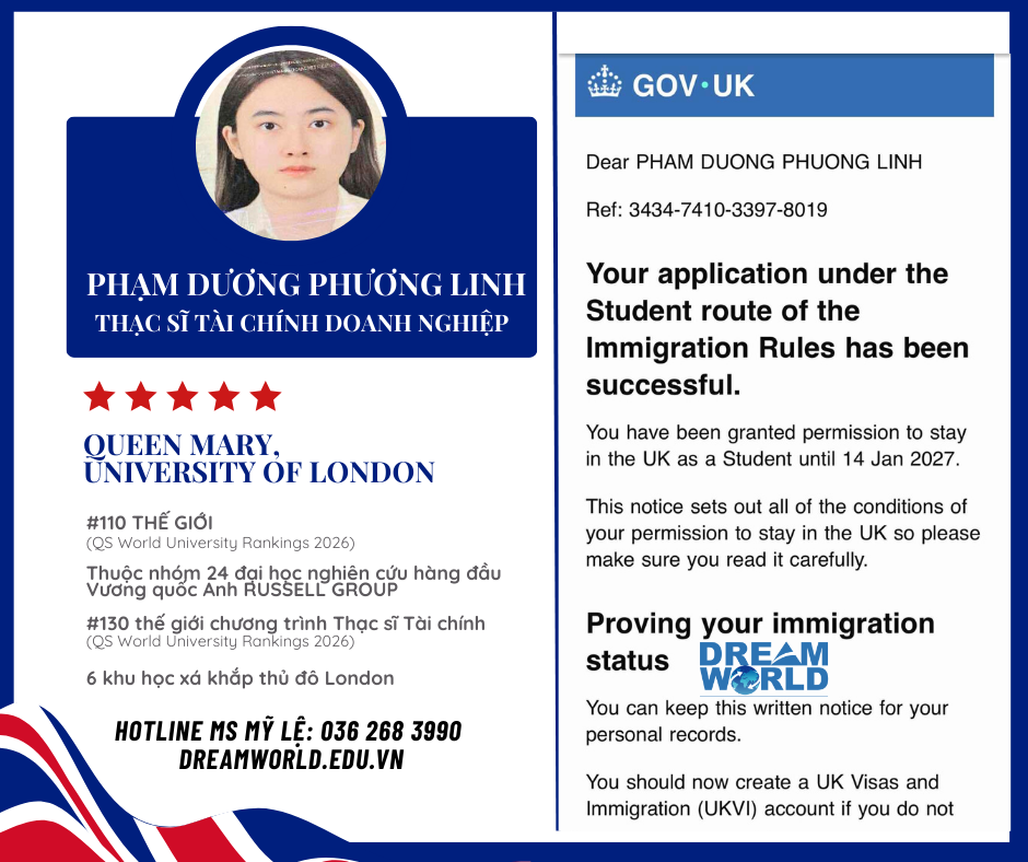Sinh viên Phạm Dương Phương Linh đậu VISA Anh và sẽ theo học tại Queen Mary, University of London - một trong những đại học danh giá và lớn bậc nhất tại thủ đô London.